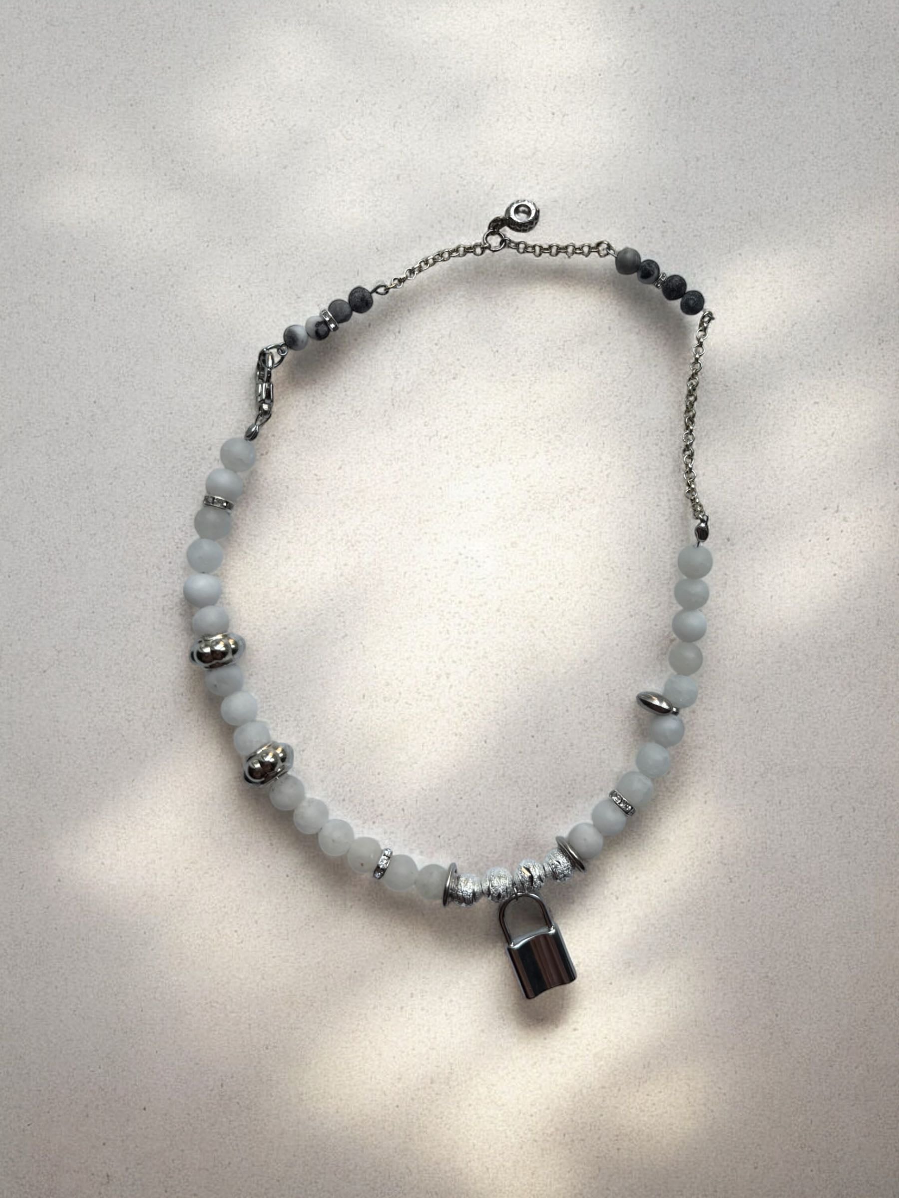 The Lock It necklace features a distinctive design combining half moonstone with half chain, creating an elegant contrast that enhances your neckline. This unique blend offers both the natural allure of moonstone and the sleekness of a chain. This is a limited design; get it now before it's gone.