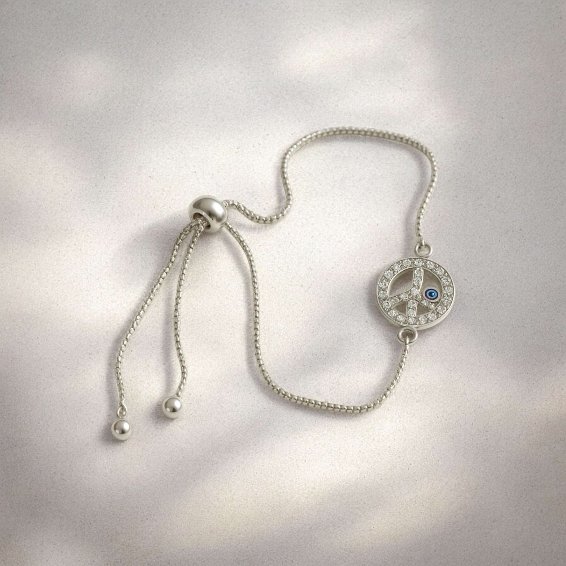 This refined bracelet features a delicate silver chain with a Peace & Love symbol, intricately designed to incorporate the All Seeing Eye at its center. Its adjustable design ensures a comfortable, personalized fit.